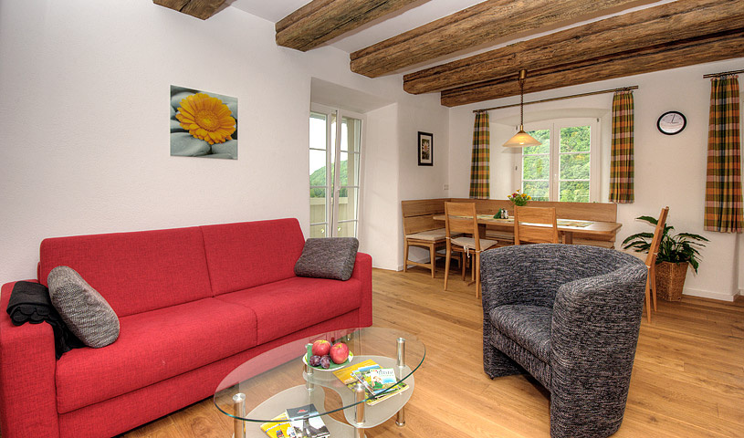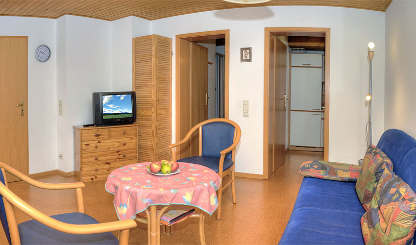 2-Zimmer-Wohnung: 1 Wohnraum und 1 Schlafraum Etage: Obergeschoss Unterkunft mit Balkon DU/WC Küche Schlafzimmer Einrichtungen für Kinder Kinderbett Kinderhochstuhl Nichtraucher-Zimmer Besteck, Geschirr Bettwäsche Fernseher im Zimmer Kaffeemaschine Radio Rauchmelder Schlafcouch Waschmaschine