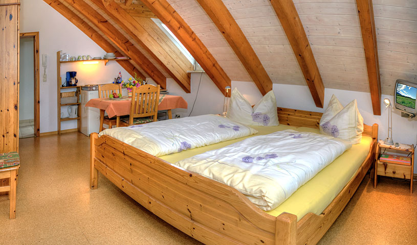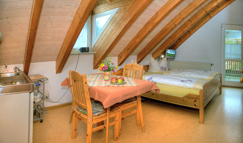 2-Zimmer-Wohnung: 1 Wohnraum und 1 Schlafraum Etage: Dachgeschoss Unterkunft mit Loggia DU/WC Küche Schlafzimmer Einrichtungen für Kinder Kinderbett Kinderhochstuhl Nichtraucher-Zimmer Besteck, Geschirr Bettwäsche Fernseher im Zimmer Kaffeemaschine Radio Rauchmelder Schlafcouch Waschmaschine