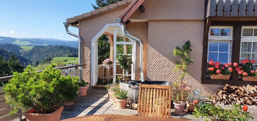 Die Komfort-Ferienwohnung »Feldbergblick« liegt im Luftkurort St. Märgen mitten im südlichen Schwarzwald. Von der nach Süden ausgerichteten sonnigen Loggia haben Sie einen wundervollen Panoramablick über die grün bewaldeten Höhen bis hinauf auf den Feldberg. Die Wohnung ist ca. 100 qm groß, dazu gehört eine etwa 90 qm große sonnige Terrasse mit Gasgrill, sowie eine Garage. Sie liegt im ersten Geschoss eines ehemaligen Schwarzwald-Hotels, und strahlt den Charme eines Hauses aus der Jahrhundertwende aus - zugleich bietet Ihnen die Wohnung durch ihre geschmackvolle Einrichtung nahezu allen Komfort, den Sie sich wünschen. -Traumterrassenobjekt-