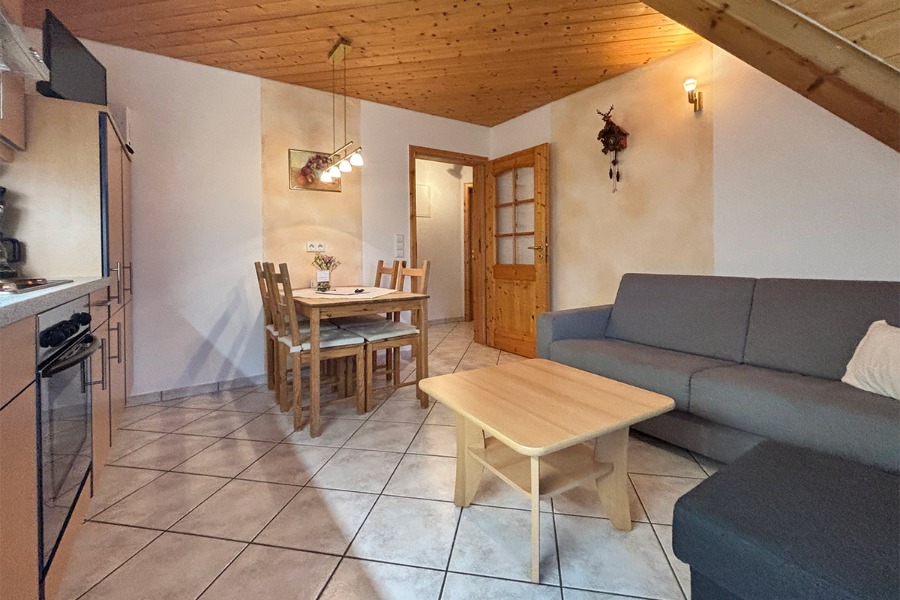 2-Zimmer-Wohnung: 1 Wohnraum und 1 Schlafraum Unterkunft mit Balkon DU/WC Wohnküche Einrichtungen für Kinder Babybett Kinderhochstuhl Nichtraucher-Zimmer Bettwäsche Doppelbett Elektroherd Fernseher im Zimmer Geschirrhandtücher Haartrockner Handtücher Herd mit Kochfeld Kaffeemaschine Kühlschrank mit Gefrierfach Schlafcouch Sitzecke Wasserkocher