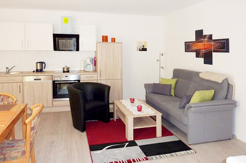2-Zimmer-Wohnung: 1 Wohnraum und 1 Schlafraum Etage: Obergeschoss Unterkunft mit Balkon DU/WC Küche Schlafzimmer Wohnküche Wohnzimmer Nichtraucher-Zimmer Backofen Besteck, Geschirr Bettwäsche Elektroherd Fernseher im Zimmer Geschirrspülmaschine Handtücher Kaffeemaschine Kochgeschirr Kühlschrank mit Gefrierfach Wasserkocher