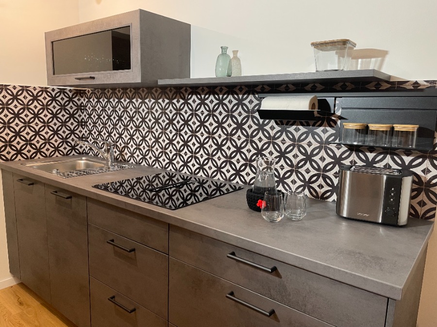 2-Zimmer-Wohnung: 1 Wohnraum und 1 Schlafraum Unterkunft mit Terrasse DU/WC Fußboden Parkett Küche Wohn- und Esszimmer mit Küche Backofen Besteck, Geschirr Bettwäsche Doppelbett Fernseher im Zimmer Fußbodenheizung Geschirrhandtücher Geschirrspülmaschine Herd mit Kochfeld Internet Kaffeemaschine Kochgeschirr Kühlschrank mit Gefrierfach Nachttisch Sitzecke Staubsauger Toaster