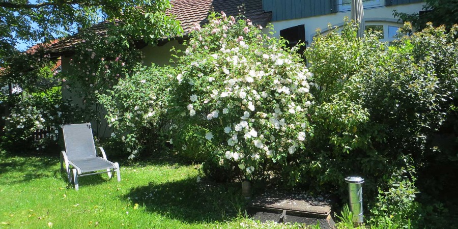 Bei uns in Schliengen-Obereggenen im sonnenverwöhnten Markgräflerland können Sie Ihren Urlaub voll und ganz genießen. Unsere Maisonette-Ferienwohnung ist umgeben von einem wunderschön angelegten Rosengarten. Hier blühen den ganzen Sommer über die verschiedensten Rosen, hauptsächlich englische und alte Sorten mit himmlischem Duft. Unter unserem Nußbaum kann man an heißen Tagen auf Liegestühlen eine sanfte Brise genießen. Wir freuen uns darauf, Sie als unsere Gäste begrüßen zu dürfen. Annette Kempf und Udo Sanio