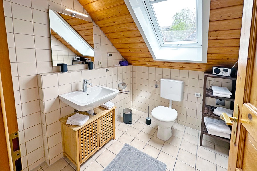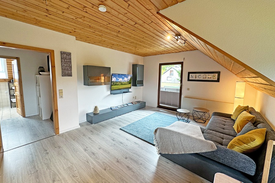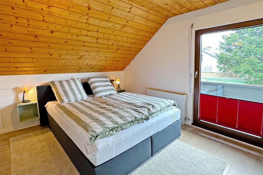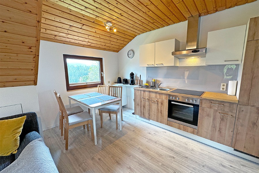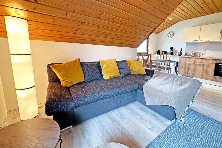 2-Zimmer-Wohnung: 1 Wohnraum und 1 Schlafraum Etage: Dachgeschoss Unterkunft mit Balkon DU/WC Küchenzeile Wohn- und Esszimmer mit Küche Einrichtungen für Kinder Babybett Kinderbett Kinderhochstuhl Backofen Bettwäsche Doppelbett Elektroherd Fernseher im Zimmer Geschirrhandtücher Herd mit Kochfeld Kaffeemaschine Kühlschrank Sitzecke Waschmaschine Wasserkocher