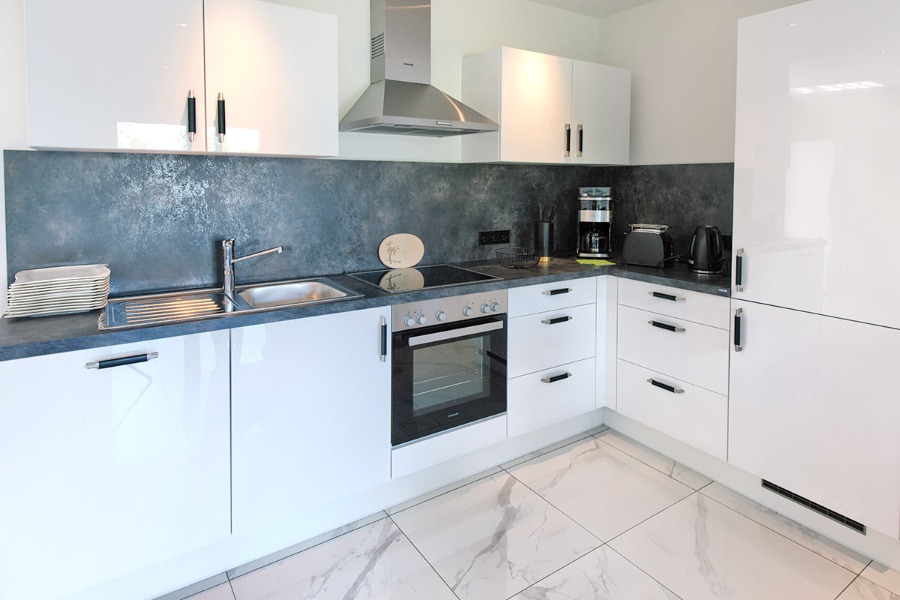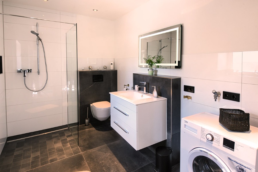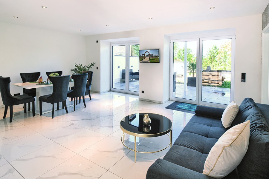 2-Zimmer-Wohnung: 1 Wohnraum und 1 Schlafraum Etage: Erdgeschoss Unterkunft mit Terrasse DU/WC Küche Schlafzimmer Wohn- und Esszimmer mit Küche Bettwäsche Doppelbett Fernseher im Zimmer Geschirrhandtücher Geschirrspülmaschine Handtücher Internet Schlafcouch Waschmaschine