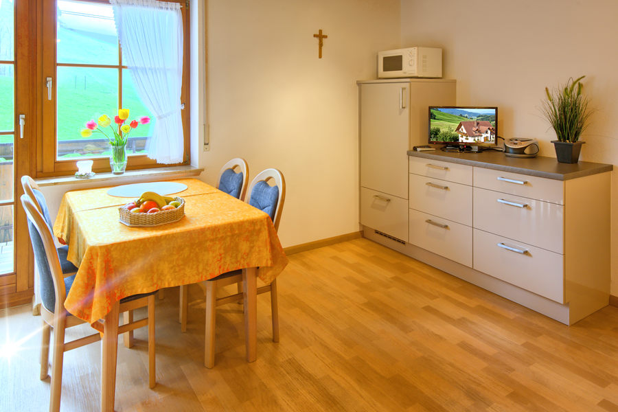 3-Zimmer-Wohnung: 1 Wohnraum und 2 Schlafräume Etage: Untergeschoss Unterkunft mit Terrasse DU/WC Küche Schlafzimmer Einrichtungen für Kinder Nichtraucher-Zimmer Besteck, Geschirr Bettwäsche Doppelbett Einzelbett Fernseher im Zimmer Geschirrhandtücher Gesellschaftsspiele Handtücher Kaffeemaschine Kochgeschirr Kühlschrank Mikrowelle Schlafcouch Sitzecke Teekocher Tischwäsche Wasserkocher