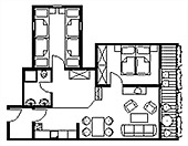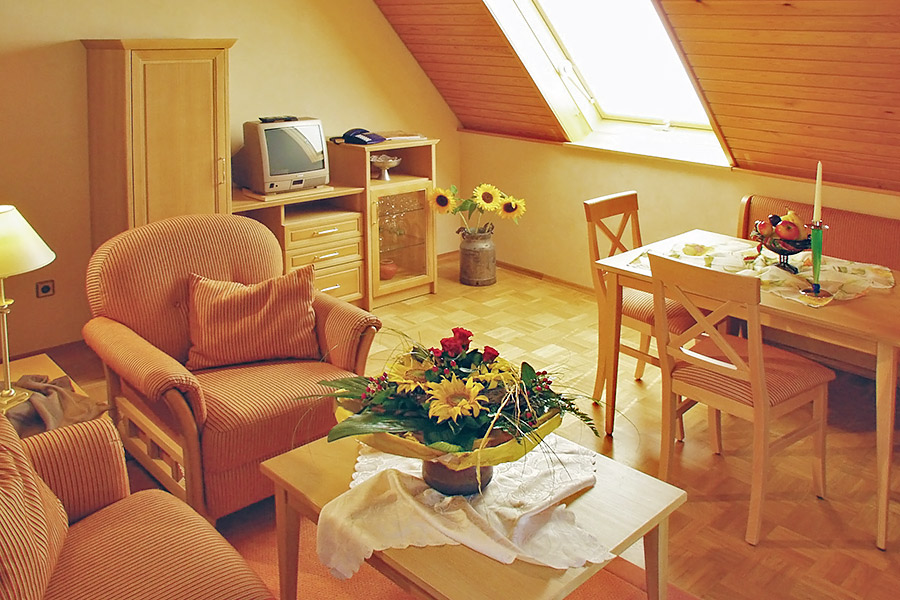 3-Zimmer-Wohnung: 1 Wohnraum und 2 Schlafräume Etage: Dachgeschoss Unterkunft mit Balkon BD/DU/WC Küche: Einbauküche Schlafzimmer Wohnzimmer Nichtraucher-Zimmer Backofen Besteck, Geschirr Bettwäsche Fernseher im Zimmer Haartrockner Handtücher Kaffeemaschine Kleiderschrank Kühlschrank Radio Schlafcouch Sitzecke