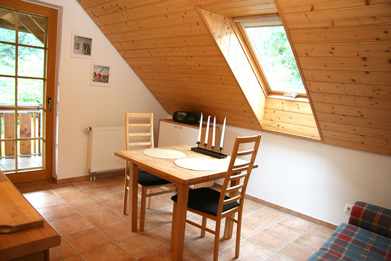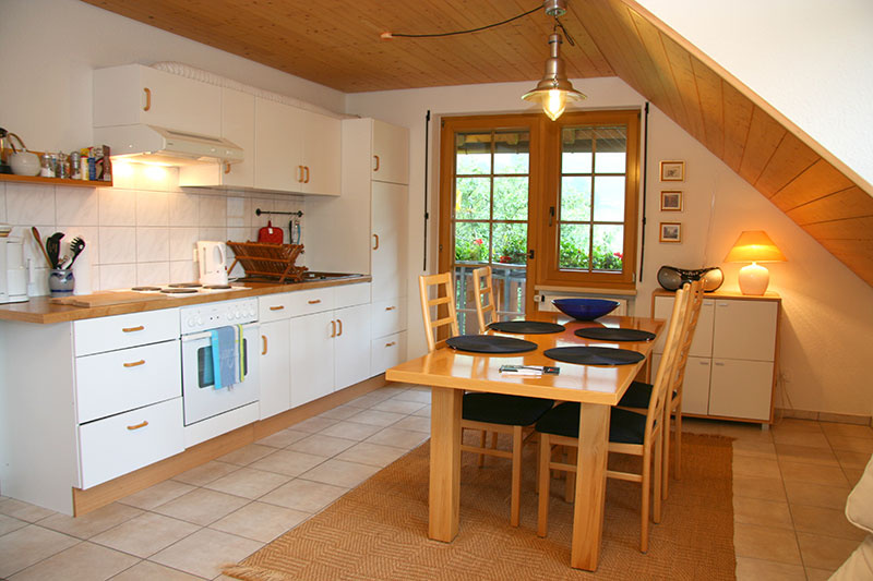 1-Zimmer-Wohnung: Wohnraum und Schlafraum in einem Etage: Obergeschoss Unterkunft mit Balkon BD/WC Küchenzeile Wohnküche Einrichtungen für Kinder Babybett Kinderbett Kinderhochstuhl Nichtraucher-Zimmer Besteck, Geschirr Bettwäsche Elektroherd Fernseher im Zimmer Handtücher Kaffeemaschine Radio