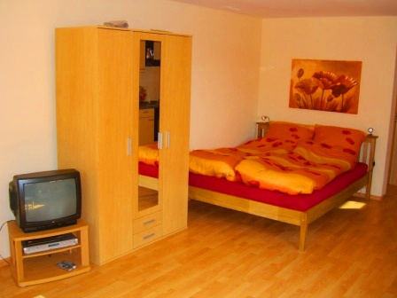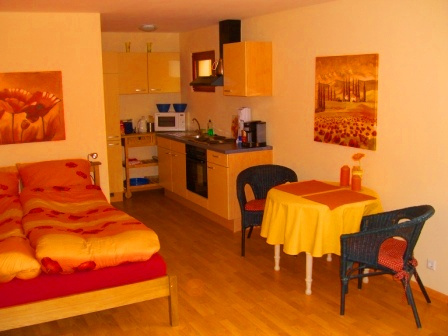 1-Zimmer-Wohnung: Wohnraum und Schlafraum in einem Etage: Erdgeschoss Unterkunft mit Terrasse DU/WC Küchenzeile Wohn- und Esszimmer mit Küche Nichtraucher-Zimmer Backofen Besteck, Geschirr Bettwäsche DVD-Player Elektroherd Fernseher im Zimmer Geschirrhandtücher Gesellschaftsspiele Mikrowelle Zustellbett