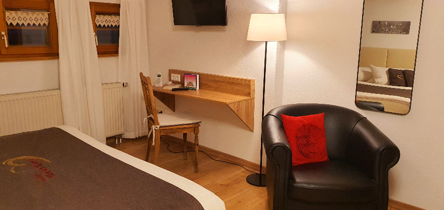 Etage: Obergeschoss Südterrasse Unterkunft mit Balkon DU/WC Fußboden Laminat Kinderhochstuhl Nichtraucher-Zimmer Besteck, Geschirr Bügelbrett Bügeleisen Doppelbett Fernseher im Zimmer Gesellschaftsspiele Haartrockner Handtücher Internet Kleiderschrank Kühlschrank Nachttisch Rauchmelder Schreibtisch Sitzecke Telefon Wasserkocher
