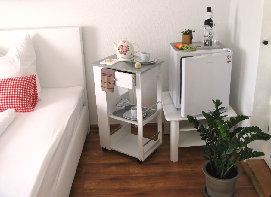 1-Zimmer-Wohnung: Wohnraum und Schlafraum in einem Etage: Obergeschoss Unterkunft mit Terrasse DU/WC Fußboden Laminat Fußboden Stein/Fließen Wohnschlafzimmer Nichtraucher-Zimmer Bettwäsche Doppelbett Fernsehanschluss vorhanden Geschirrhandtücher Haartrockner Handtücher Internet Kaffeemaschine Kühlschrank Nachttisch Radiowecker Rauchmelder Safe Sitzecke Staubsauger Wasserkocher Business-Zimmer