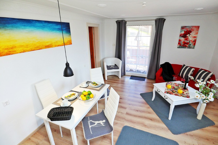2-Zimmer-Wohnung: 1 Wohnraum und 1 Schlafraum Unterkunft mit Balkon oder Terrasse BD/DU/WC DU/WC Fußboden Laminat Küchenzeile Schlafzimmer Verbindungstür Wohn- und Esszimmer mit Küche Nichtraucher-Zimmer Besteck, Geschirr Bettwäsche Bügelbrett Bügeleisen Doppelbett Dunstabzugshaube Elektroherd Fernsehanschluss vorhanden Fernseher im Zimmer Fernsehsessel Geschirrhandtücher Haartrockner Handtücher Herd mit Kochfeld Internet Kaffeemaschine Kleiderschrank Kochgeschirr Kühlschrank Mikrowelle Nachttisch PayTV im Zimmer Radio Rauchmelder Safe Schreibtisch Sitzecke Staubsauger Tischwäsche Toaster Wasserkocher