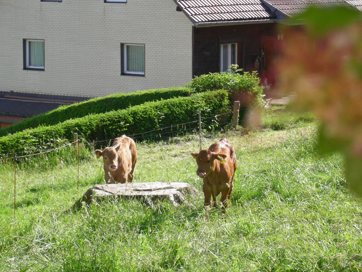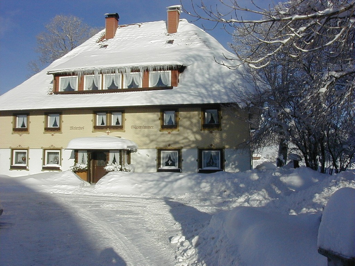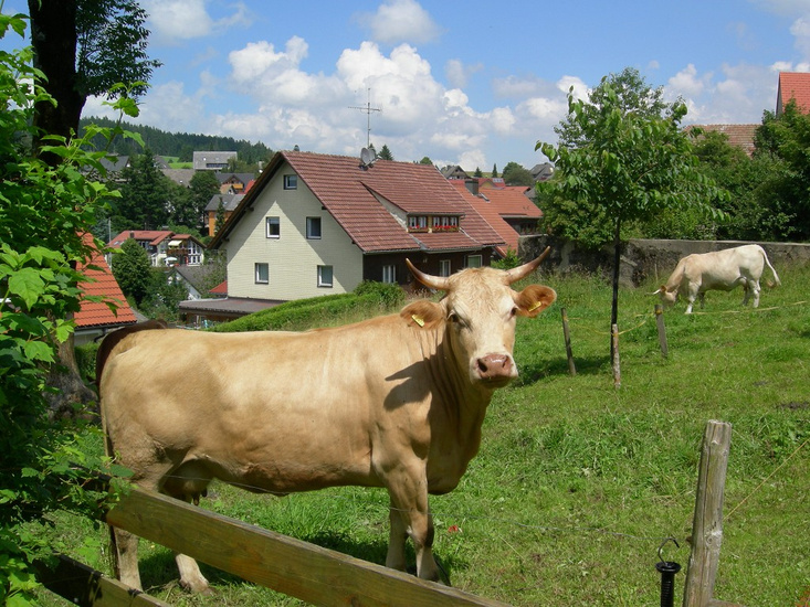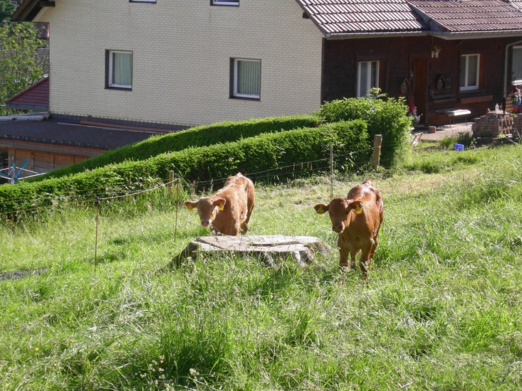 Der Meierhof liegt im Ortskern von St. Märgen umgeben von Wiesen und Feldern, mit Weitblick in die traumhafte Schwarzwaldlandschaft. Im Sommer weidet unsere kleine Kuhherde mir ihren Kälbchen direkt ums Haus, die Hasengesellschaft lässt es sich im Kleingehege gutgehen.