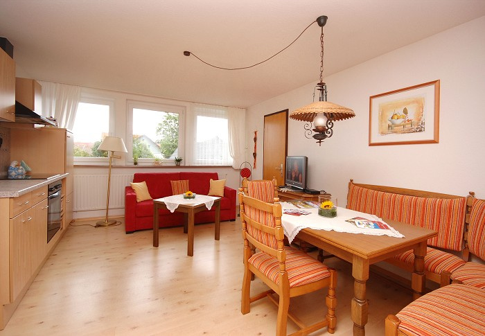2-Zimmer-Wohnung: 1 Wohnraum und 1 Schlafraum Etage: Obergeschoss DU/WC Küchenzeile Wohnküche Einrichtungen für Kinder Kinderbett Nichtraucher-Zimmer Besteck, Geschirr Bettwäsche Fernseher im Zimmer Geschirrhandtücher Handtücher Radio Schlafcouch Tischwäsche