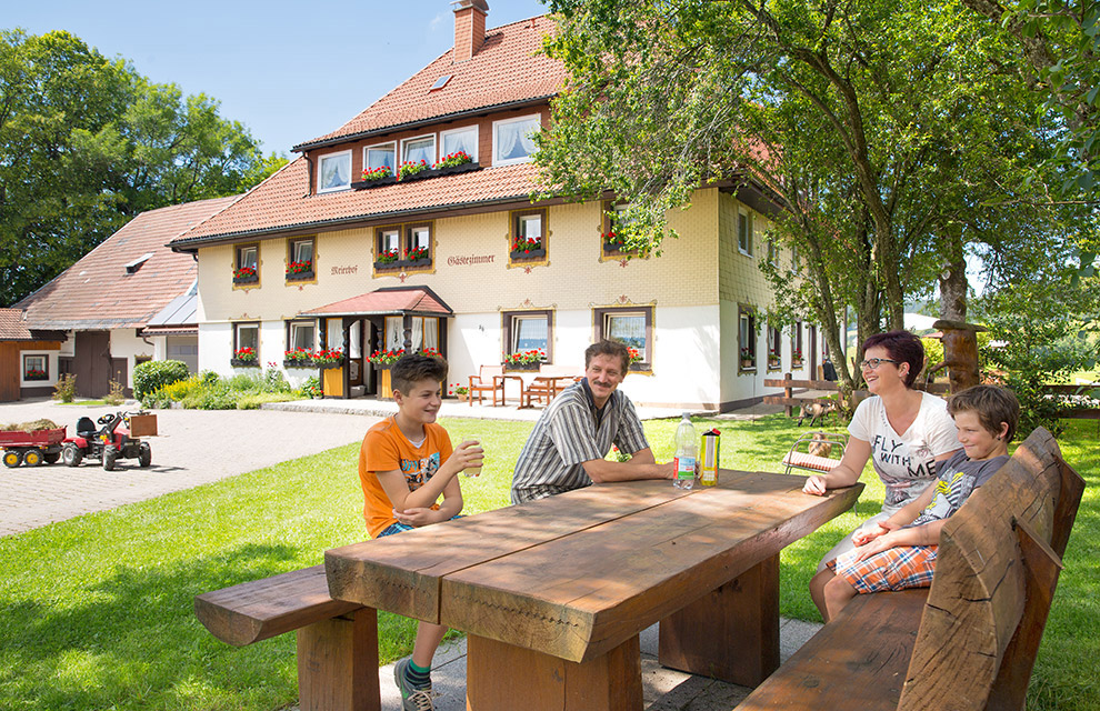 Der Meierhof liegt im Ortskern von St. Märgen umgeben von Wiesen und Feldern, mit Weitblick in die traumhafte Schwarzwaldlandschaft. Im Sommer weidet unsere kleine Kuhherde mir ihren Kälbchen direkt ums Haus, die Hasengesellschaft lässt es sich im Kleingehege gutgehen.
