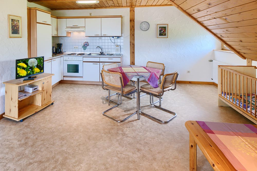 3-Zimmer-Wohnung: 1 Wohnraum und 2 Schlafräume Etage: Obergeschoss Unterkunft mit Balkon DU/WC Küchenzeile Schlafzimmer Wohn- und Esszimmer Wohnschlafzimmer Einrichtungen für Kinder Babybett Nichtraucher-Zimmer Backofen Besteck, Geschirr Bettwäsche Doppelbett Elektroherd Fernseher im Zimmer Gesellschaftsspiele Kaffeemaschine Kleiderschrank Kochgeschirr Kühlschrank Sitzecke Wasserkocher