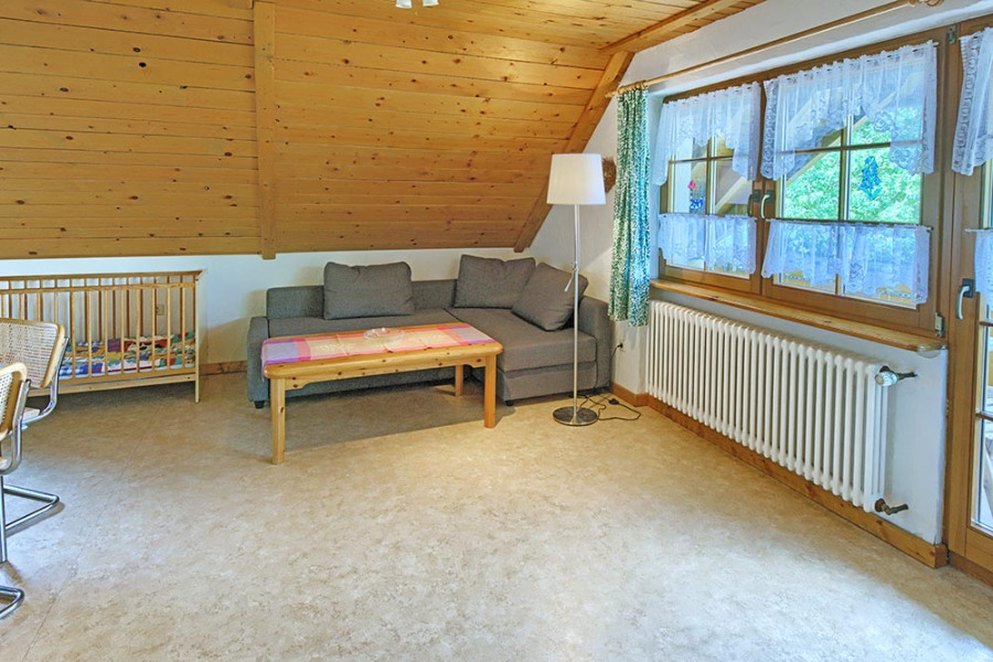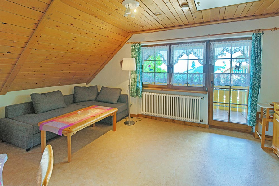 2-Zimmer-Wohnung: 1 Wohnraum und 1 Schlafraum Etage: Obergeschoss Unterkunft mit Balkon DU/WC Küchenzeile Schlafzimmer Wohn- und Esszimmer Wohnschlafzimmer Einrichtungen für Kinder Babybett Nichtraucher-Zimmer Backofen Besteck, Geschirr Bettwäsche Doppelbett Elektroherd Fernseher im Zimmer Gesellschaftsspiele Kaffeemaschine Kleiderschrank Kochgeschirr Kühlschrank Sitzecke Wasserkocher