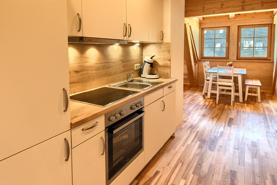 2-Zimmer-Wohnung: 1 Wohnraum und 1 Schlafraum Etage: Obergeschoss Unterkunft mit Balkon DU/WC Wohn- und Esszimmer mit Küche Backofen Bettwäsche Doppelbett Elektroherd Fernseher im Zimmer Herd mit Kochfeld Sitzecke