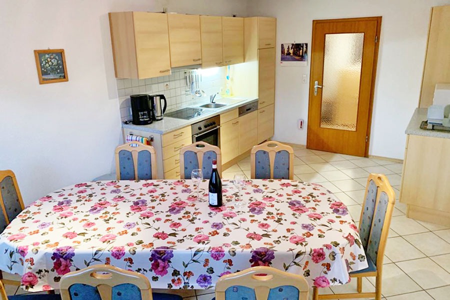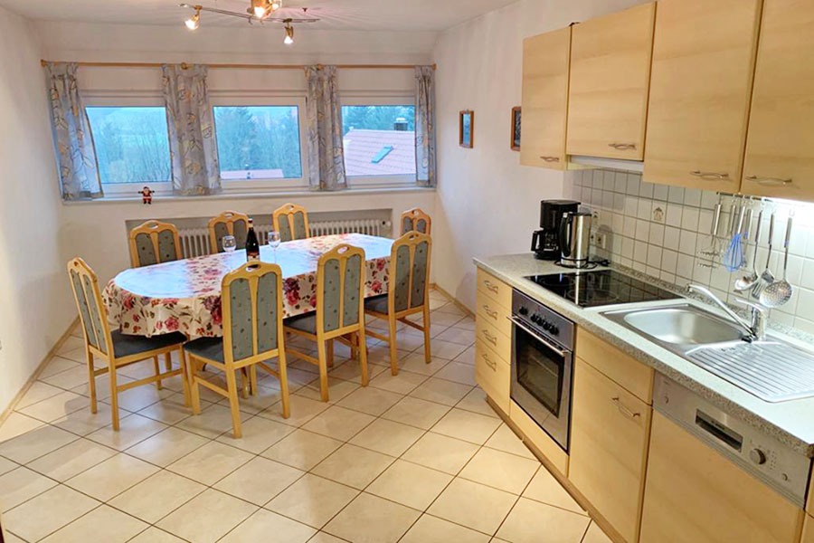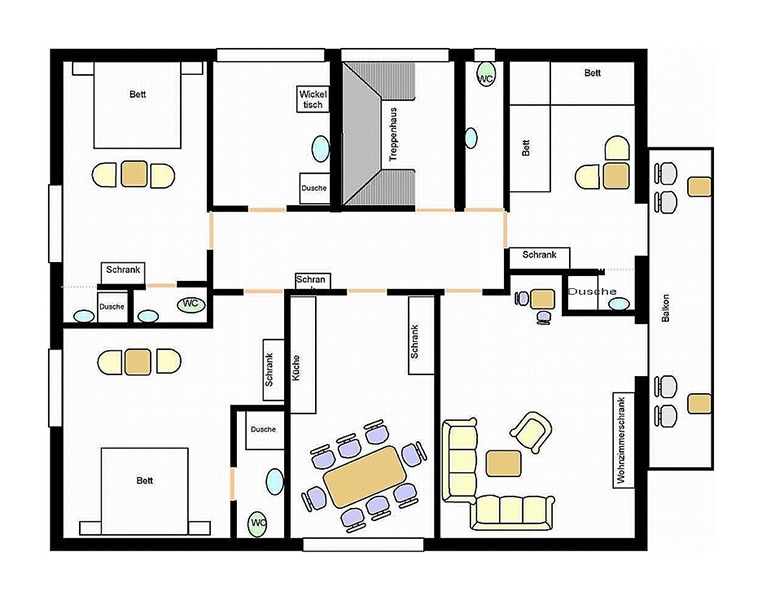 4-Zimmer-Wohnung: 1 Wohnraum und 3 Schlafräume Etage: Obergeschoss Unterkunft mit Balkon DU/WC Küche Schlafzimmer Wohnküche Wohnzimmer Einrichtungen für Kinder Kinderbett Kinderhochstuhl Bettwäsche Doppelbett Fernseher im Zimmer Geschirrspülmaschine Wäschetrockner Waschmaschine